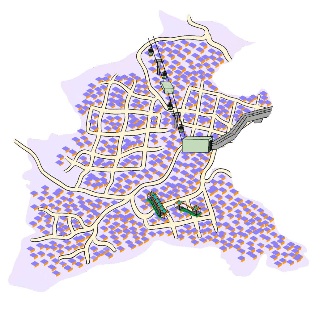 Ubicada en la Zona 4 Centro Occidental de Medellín, San Javier alberga una población en su mayoría perteneciente a los estratos 1 y 2. En medio de unas condiciones geográficas poco favorables (laderas empinadas, callejones y vías estrechas), la falta de planificación urbana y la poca presencia estatal dieron lugar a un crecimiento desordenado, con barrios de alta densidad, problemas de movilidad y condiciones de vivienda precarias. A estas problemáticas se suma el control territorial que han ejercido actores armados ilegales. Sin embargo, la comunidad ha establecido fuertes redes de organización social y cultural orientadas a la reconstrucción del tejido social mediante el arte y la participación ciudadana.